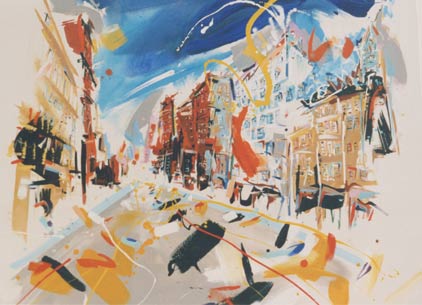 The painting for auction is from the New York Series; 'Lower Broadway, Manhattan' 58 x 68 inches, Acrylic on Canvas.